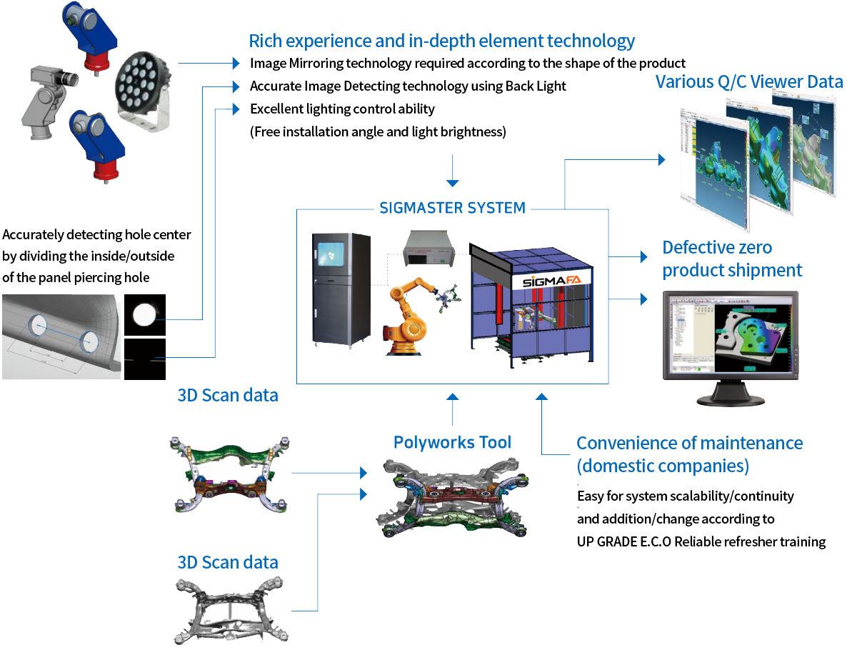 It is a quality keeper that guarantees perfect quality by scanning the shape of a product with a 3D SCANER and analyzing it with SIGMASTER, a shape analysis algorithm, to see if there are any missing parts or if the dimensions are satisfied.