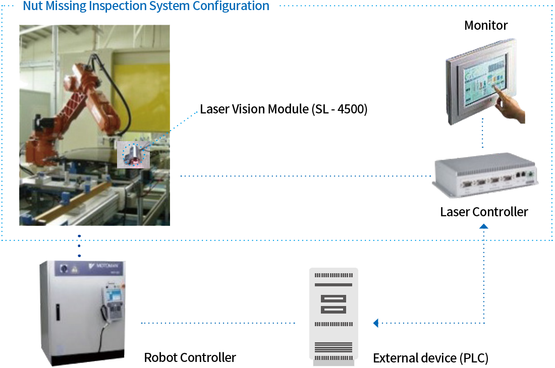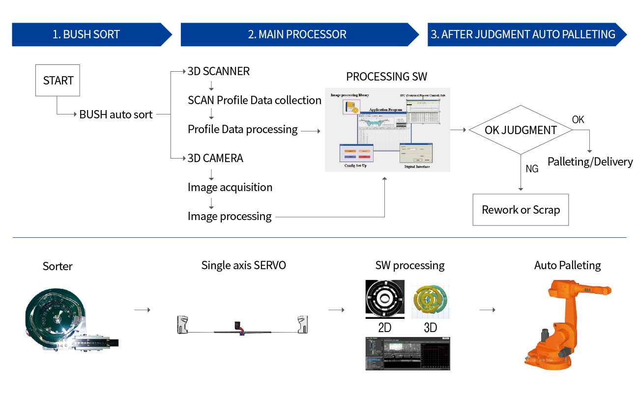 It is a system that 3D scans the product to inspect the quality, judges good or bad, and separates it into a pass box and a bad box, respectively.