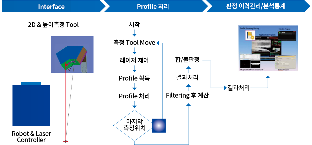 용접비드의 형상을 3D SCAN하여 그 형상을 분석하여 용접장, 비드단면적, 목두께, 각장 등을 측정하여 용접품질의 합.부판정을하는 시스템입니다.