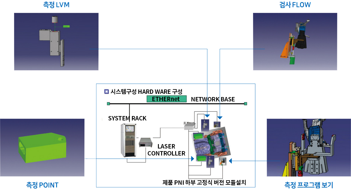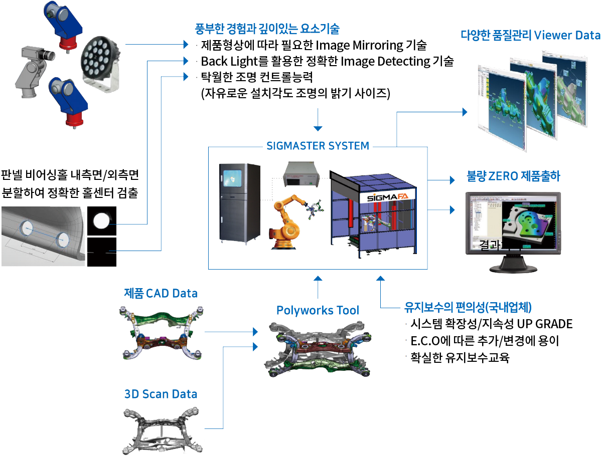 제품의 형상을 3D SCANER로 SCAN하여 형상분석 알고리즘인 SIGMASTER가 분석하여 Part누락은 없는지,정위치 디멘젼은 만족하는지를 검사하여 완벽한 품질보증을하는 품질 지킴이입니다.