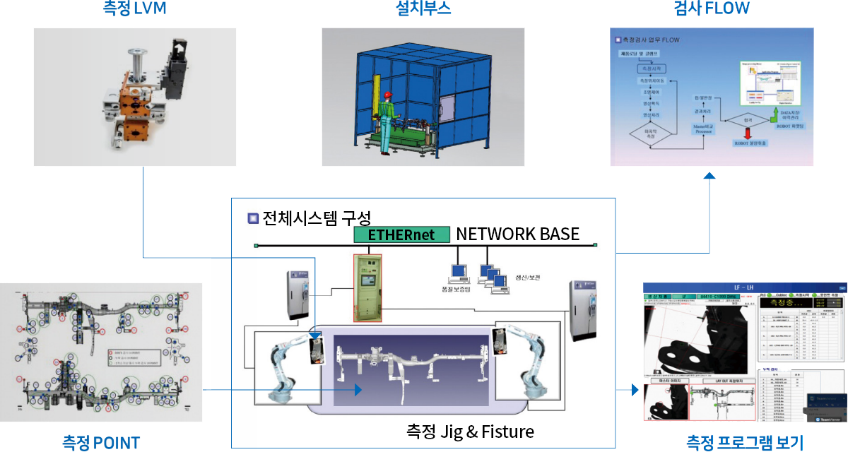 자동차 부품중에 카울크로스바라는 부품의 품질을 검사하는 시스템으로서 MDPS측정,가이드핀간의 절대거리,각종 Part누락검사, 스터드볼트의 정위치검사등을 수행합니다.