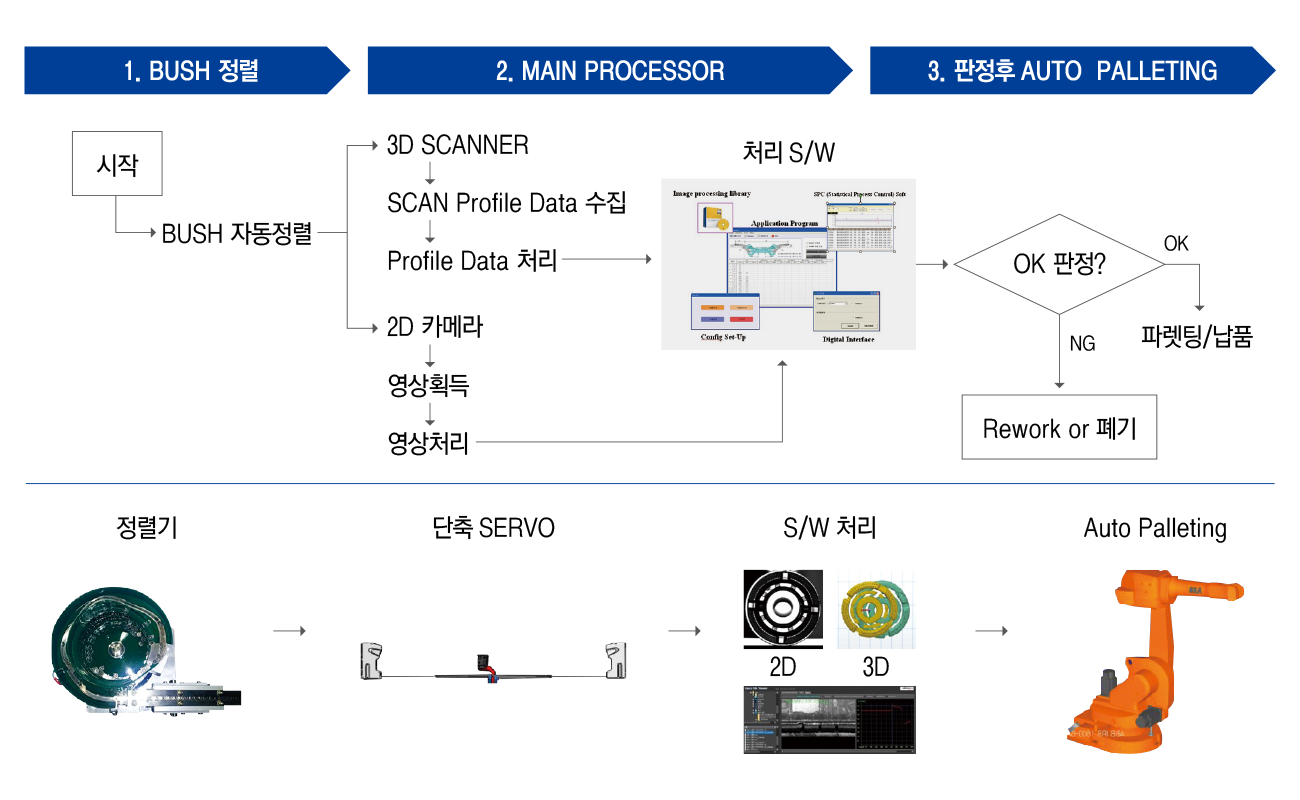 제품을 3D SCAN하여 품질을 검사하고 양.불을 판정하여 각각 합격BOX와 불량 BOX로 분리하여 담는 시스템입니다. 딥런닝을 통한 완벽한 품질지킴이 로서 다수의 품질검사요원을 대체하여 원가절감을 실현해줄수있는 시스템입니다.