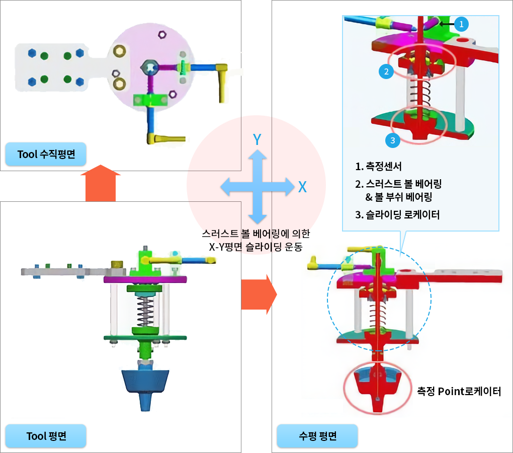 X-Y평면에서 측정 Point(기준점)에서 최대 +/- 5mm 범위 내의 point변화를 측정